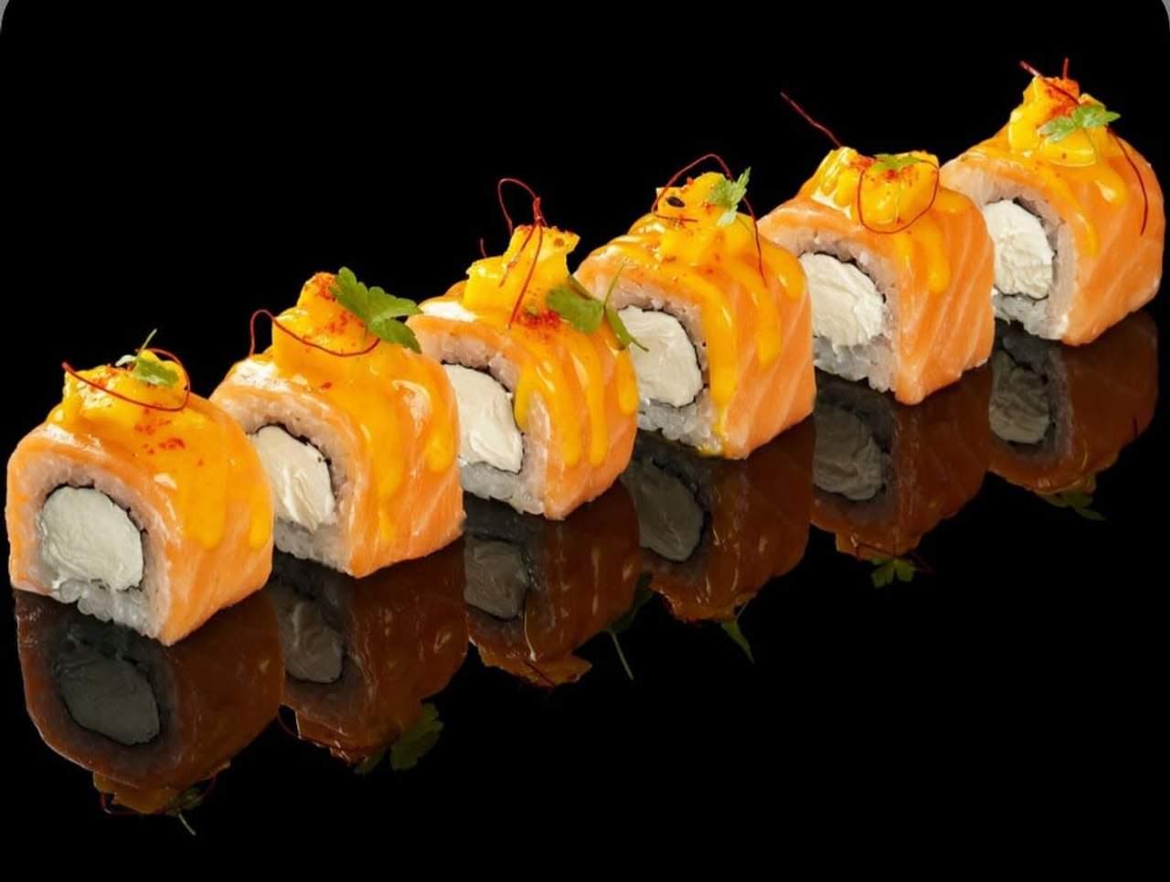 Բրինձ, ավոկադո, պանիր, սաղմոն, օձաձուկ (3 կողմից պատված), ունագի սոուս, քունջութ