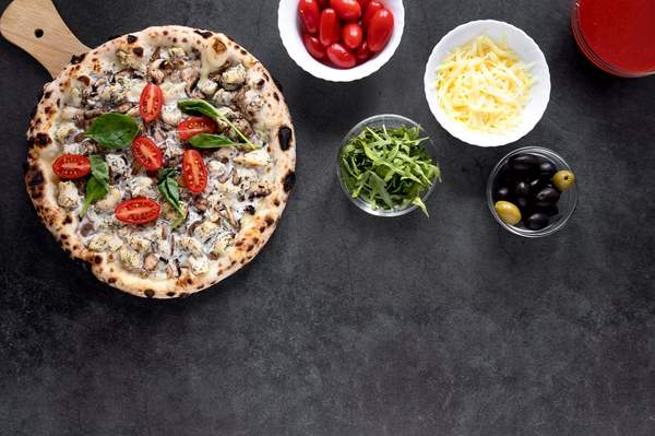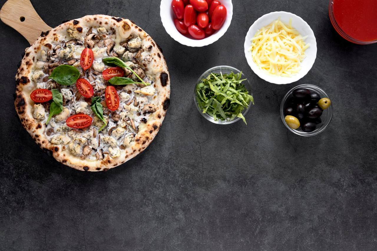 Paradajz, sir, origano, šampinjoni, sudžuka, jaje, masline