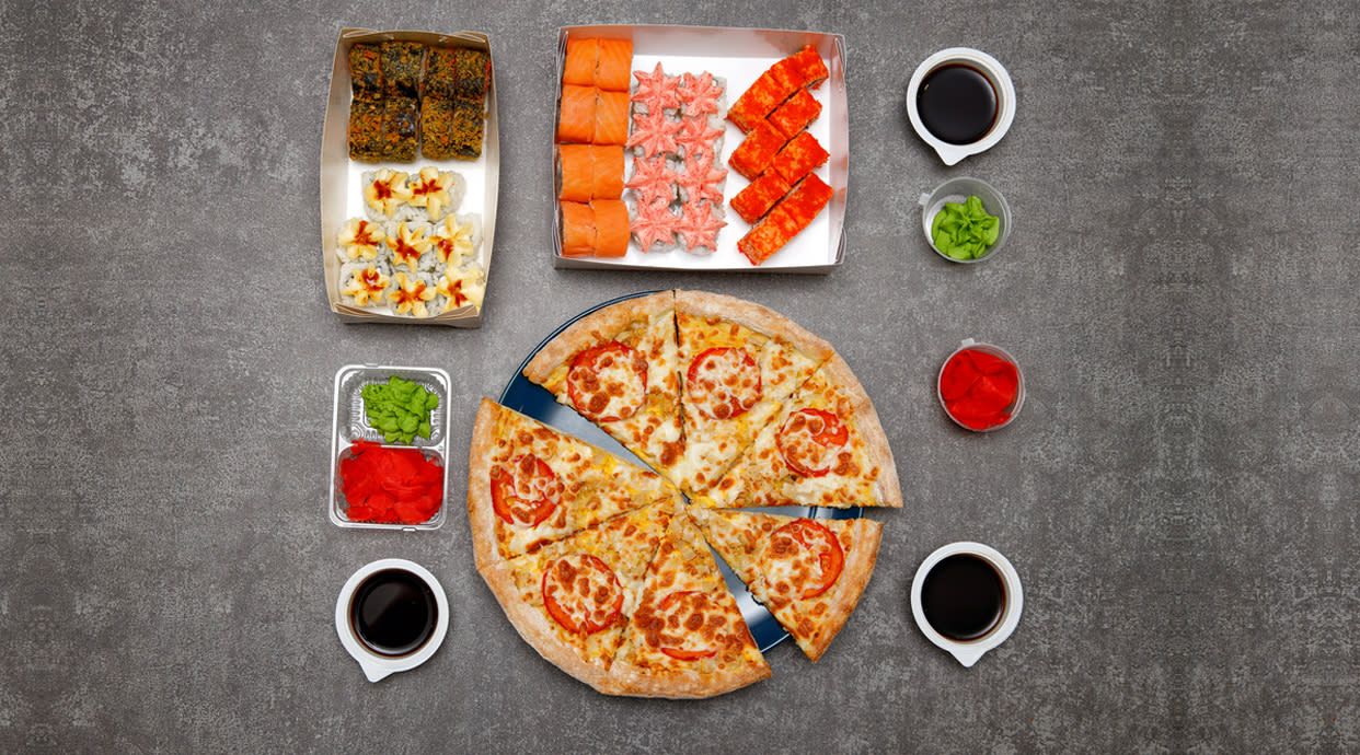 ориз, нори, сьомга, риба тон, скарида, тобико, краставица, авокадо
