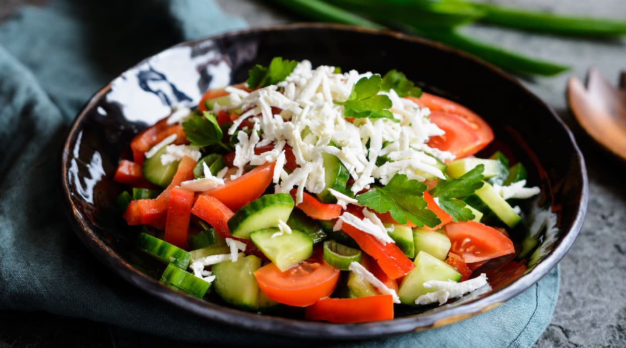Домати, краставици, прясна пиперка, лук, сирене, магданоз, люта чушка