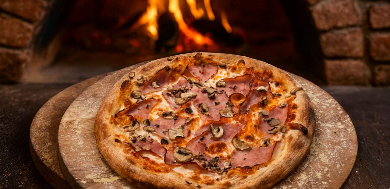 Пица с тесто, втасвало 72 часа, приготвено с италианско брашно Caputo. Гарнирана с доматен сос, моцарела Fior di Latte, прошуто кото, маслини и гъби. „ Хрупкава и наситена с вкус".
