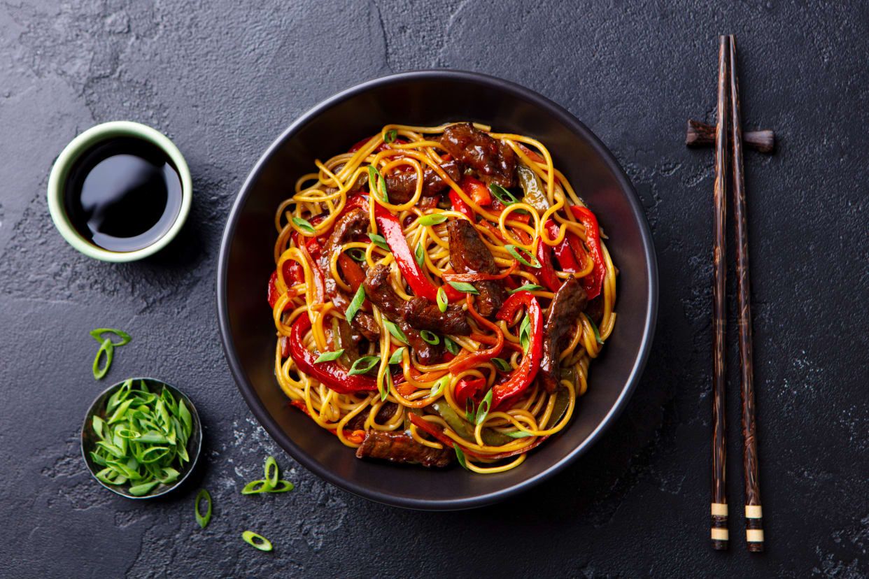 49. Пържени спагети с пилешко, свинско и телешко (800гр)