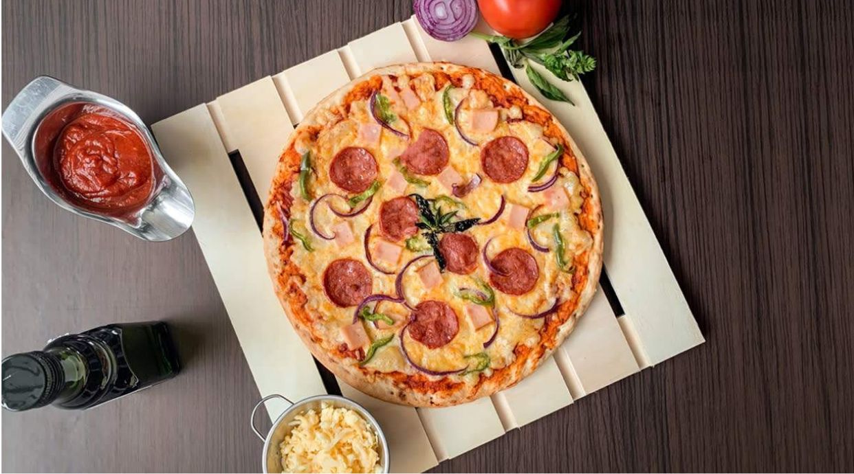 Сос, моцарела, колбас пеперони, гъби, колбас вентричина, топено сирене, зелени чушки - 500г