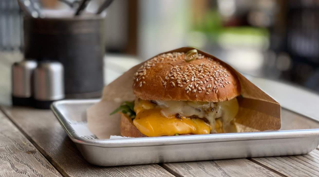 Питка, телешко кюфте, чедър, бургер сос, чили сос, свежи салатки, домат, кисели краставички, халапеньо и пържени картофи