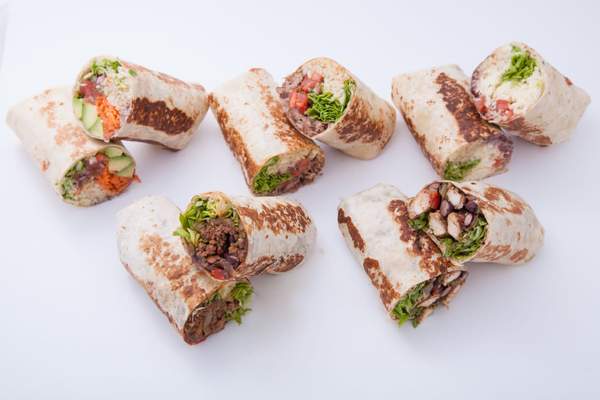 Натурална тортиля; плънка с пилешко бон филе, лук, пипер и червен боб ( сготвено заедно); салата айсберг; бобена паста, авокадо сос; подправки; млечен сос, лют сос (по желание)