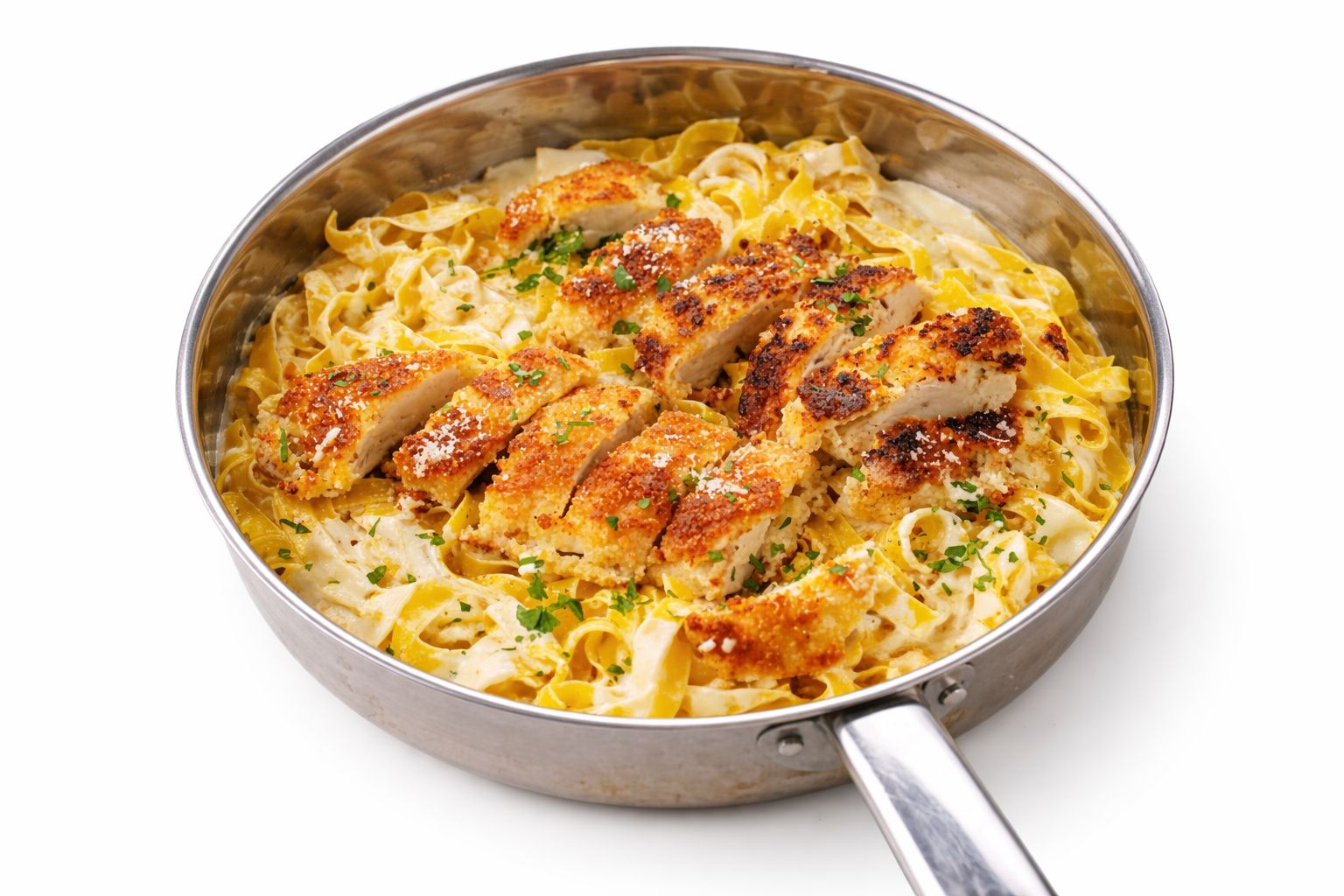 Tagliatelles onctueuses poulet pané et de crème au fromage