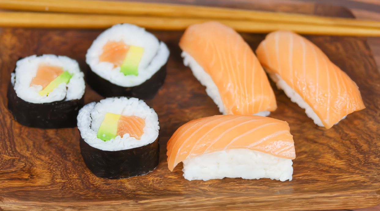 6 nigiri de salmón, 8 piezas de uramaki de salmón, 6 piezas de hosomaki de salmón