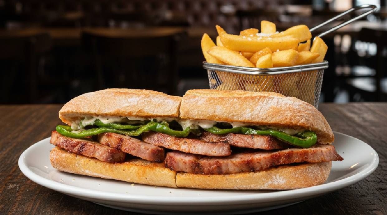 Clásico bocadillo con filete, jamón serrano y pimiento.