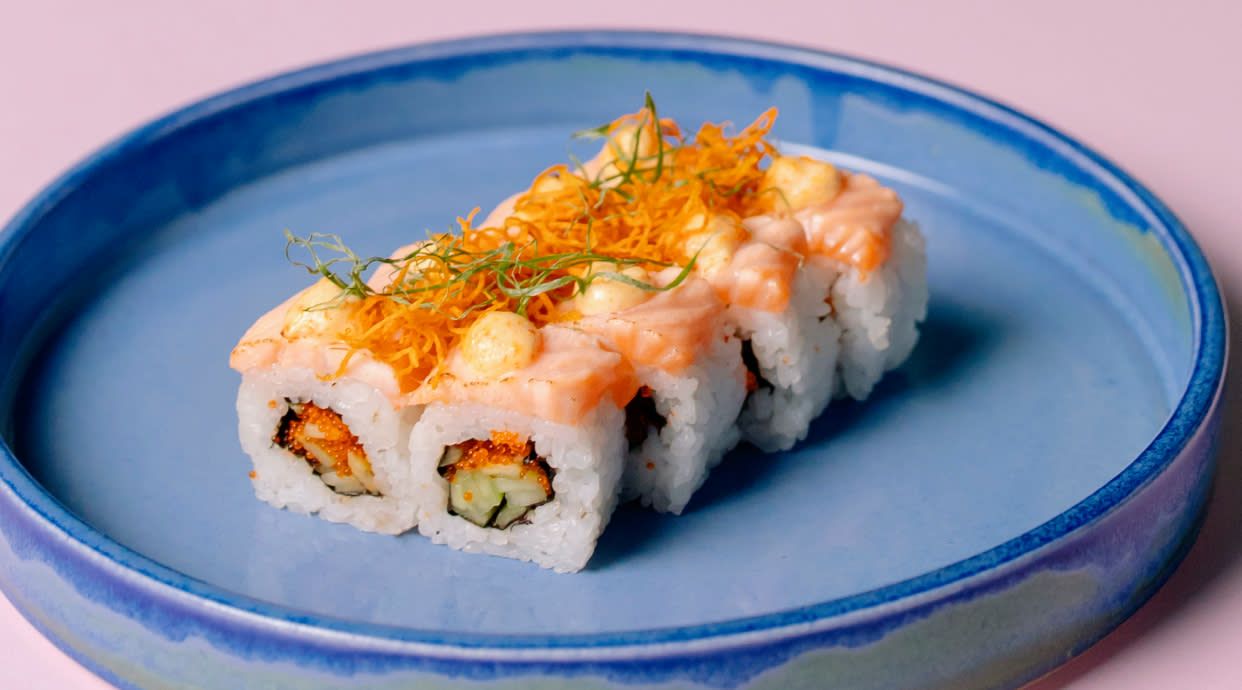 Salmón, calamar, pepino, aguacate, queso crema, mayonesa, tobiko y arroz