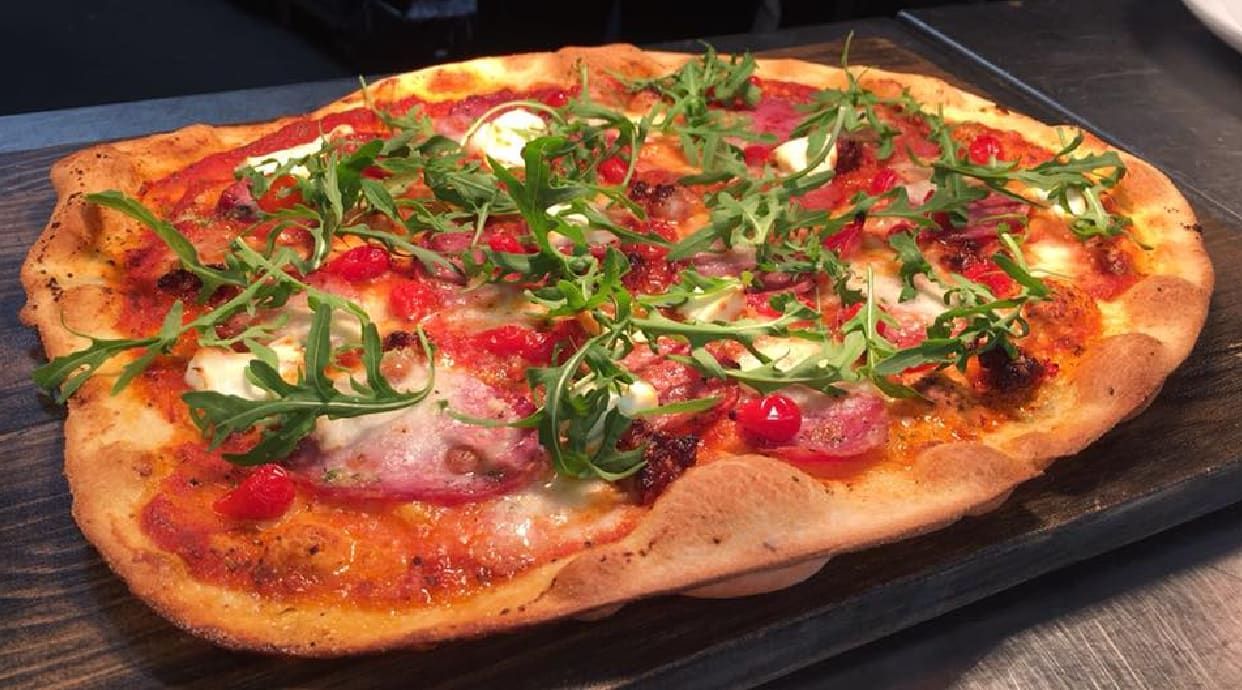 Búfala, tomate cherry, rúcula, prosciutto di parma y salsa de trufa