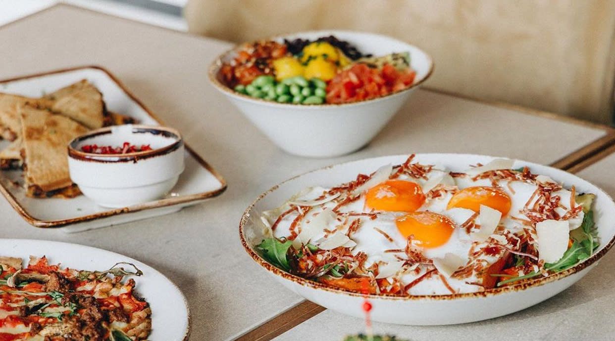 huevos revueltos con queso crema, aguacate, escamas de pimentón y sal negra