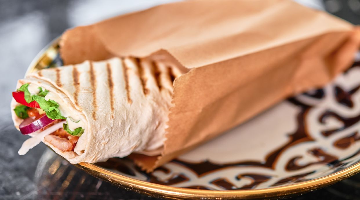 Tomate, cebolla, lechuga, carne shawarma y salsa de yogur