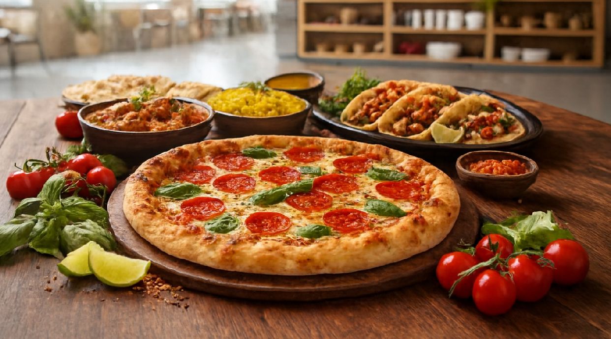 Tomate, mozzarella, jamón, champiñones, pimientos y pepperoni