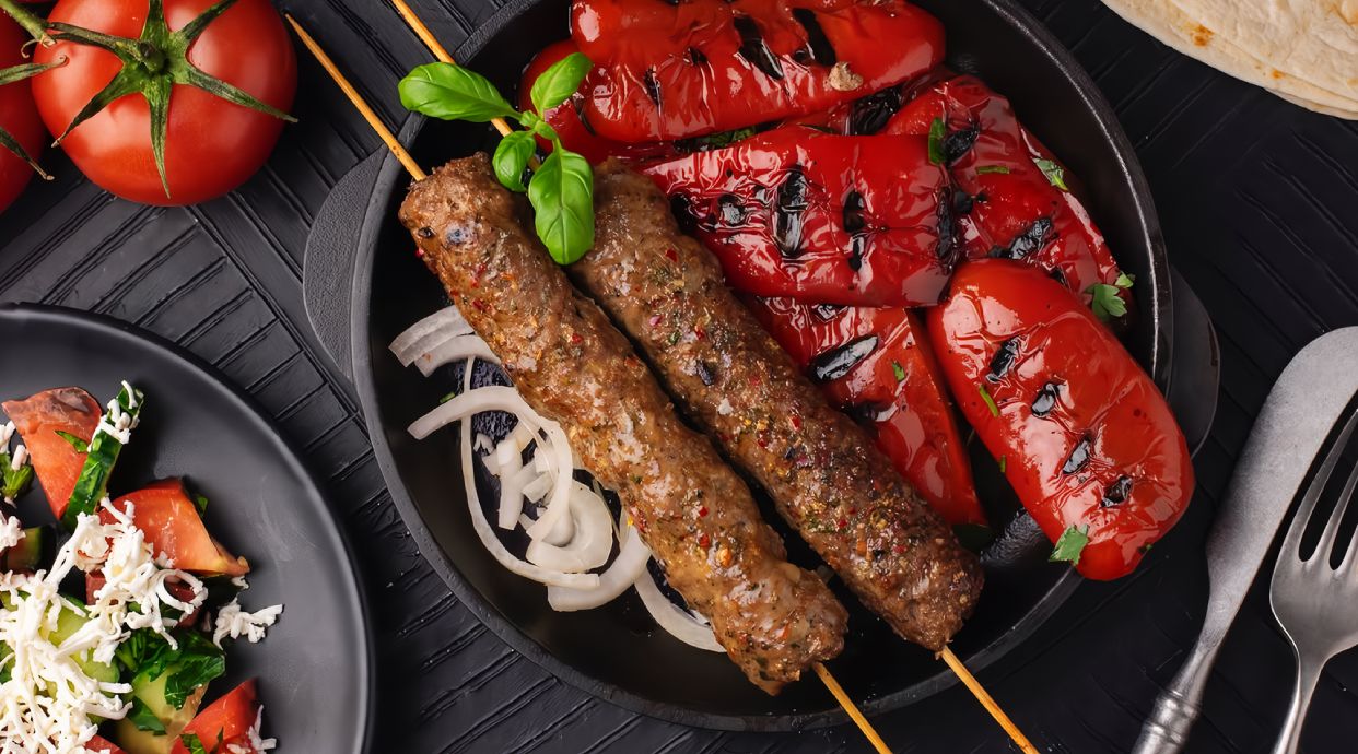 Carne de kebab pollo o ternera con lechuga, tomate, pepinillos, cebolla caramelizada y salsa nazar picante