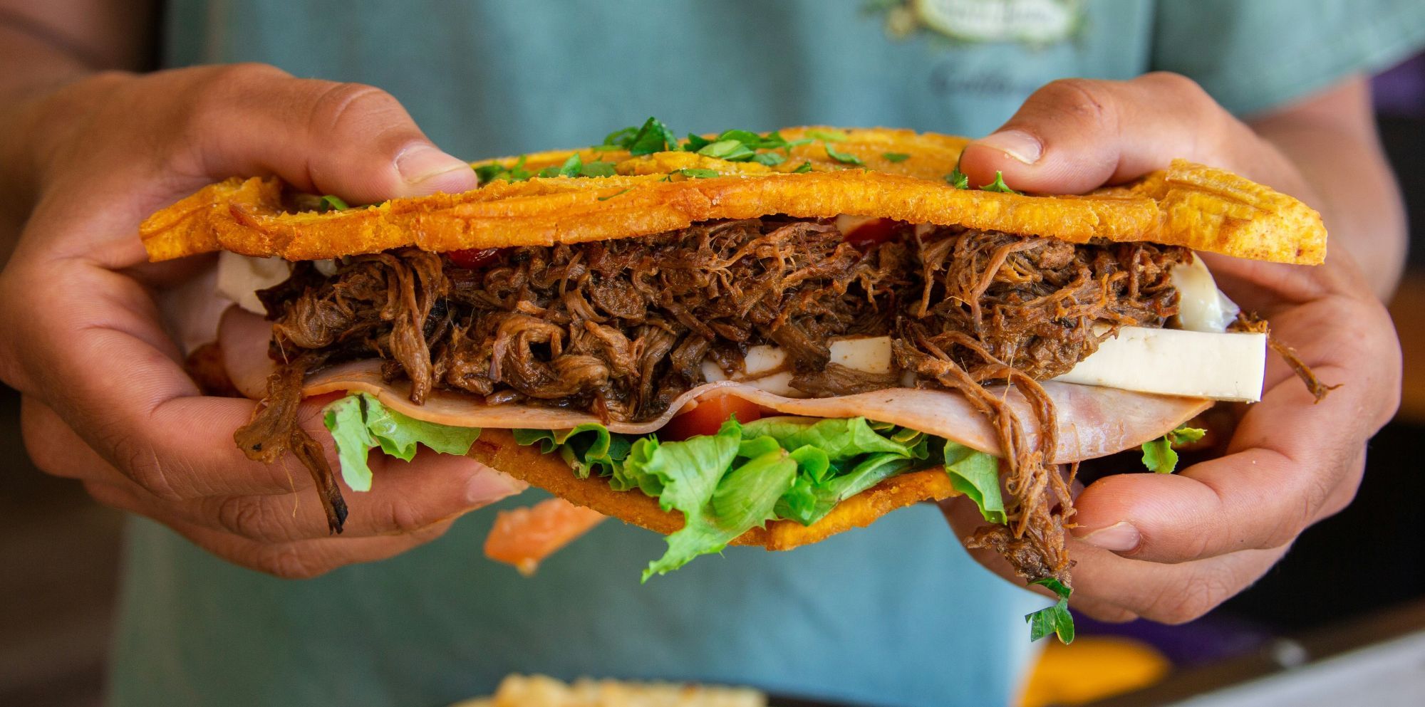 Lechuga, tomate, carne de chuleta, queso, cebolla caramelizada, plátano maduro, queso costeño, carne desmechada, salsas de la casa y patatas fritas.