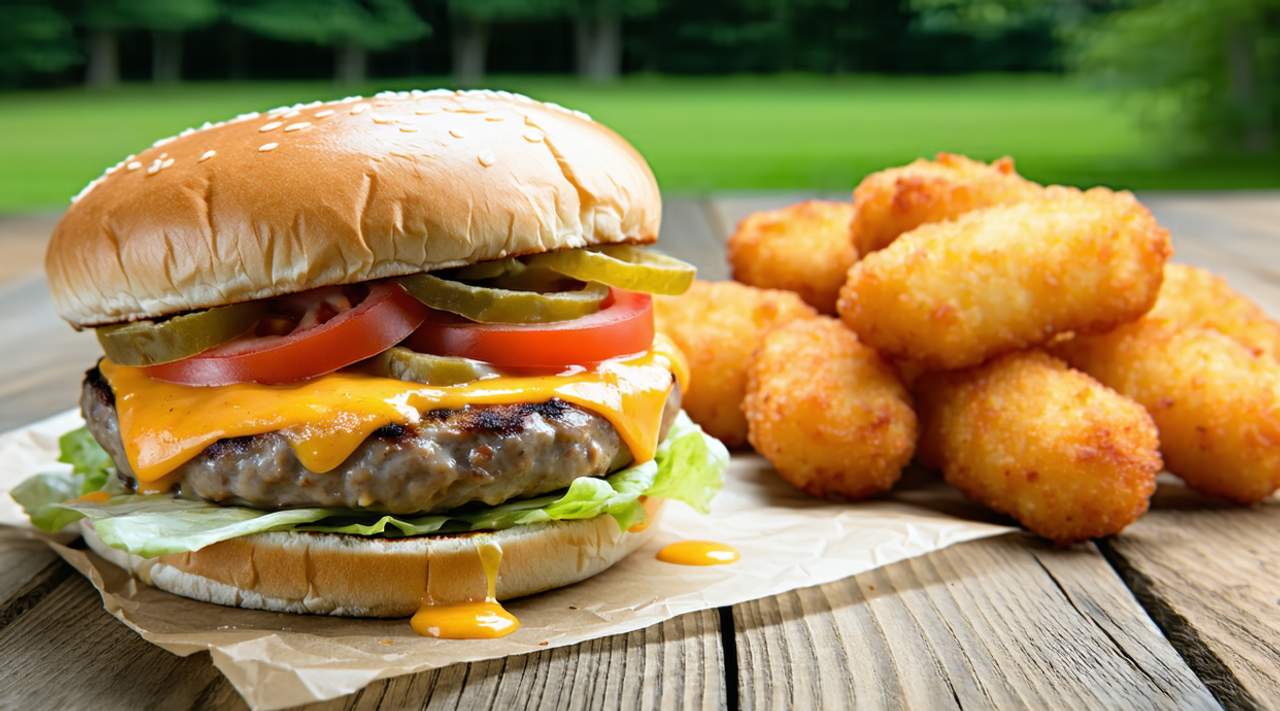Ternera con pan brioche, cheddar curado frito y mermelada de bacon, incluye patatas fritas