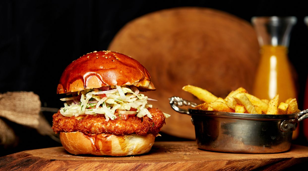 Con pan brezel, salsa burger, tomate, lollo rojo, rabanillo, pepinillo y salsa chilli y ensalada a elegir