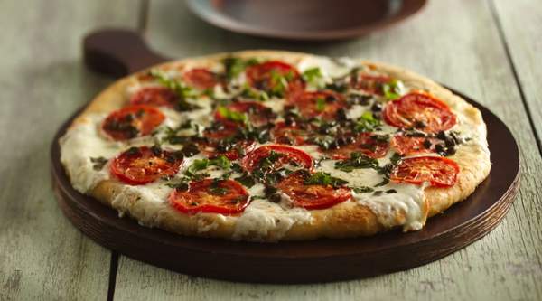Tomate, mozzarella, cabrales, jamón cocido, champiñón, aceitunas, alcaparras, pimiento y albahaca