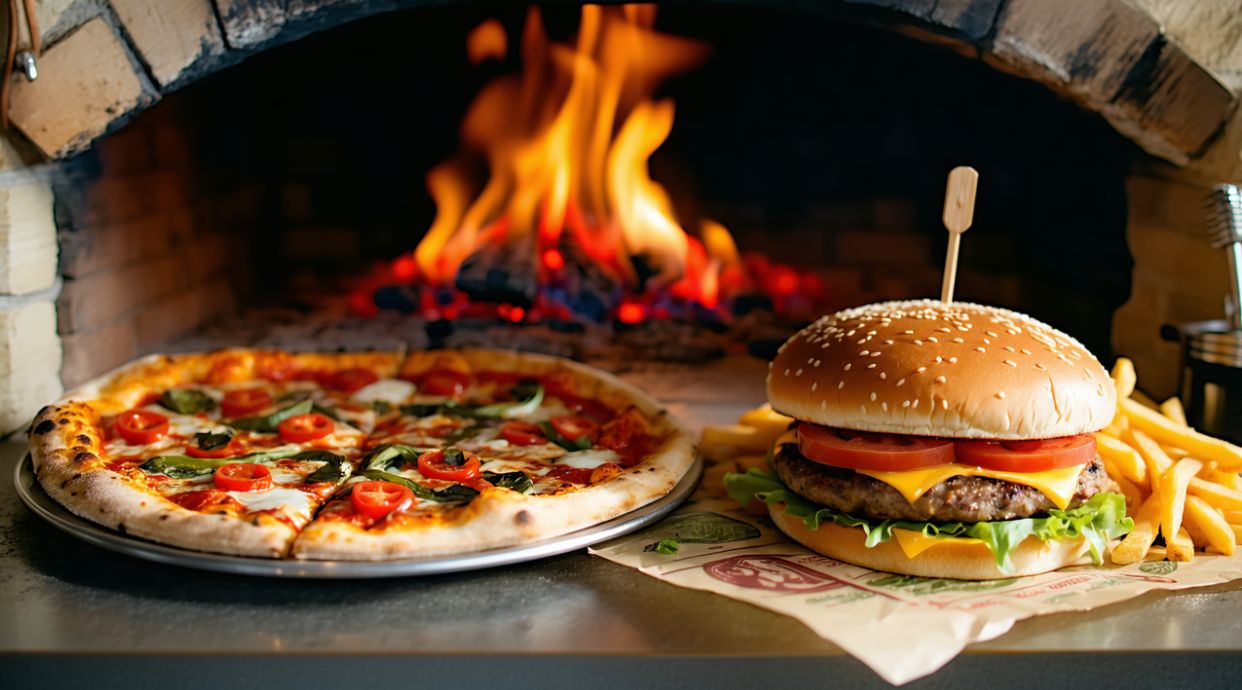Carne, fondente de patatas, queso cheddar, pepinillo, ternera, cebolla caramelizada, tomates y lechuga.