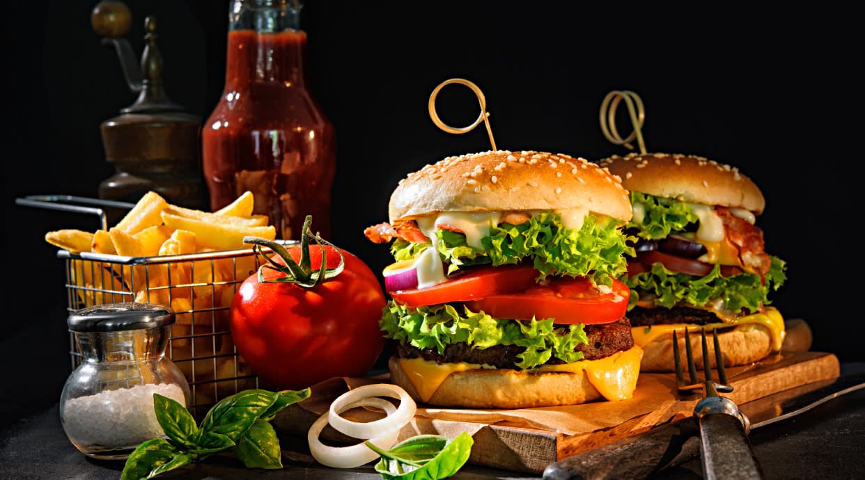 Hamburguesa, huevo frito, tomate, cebolla frita, queso y bacon
