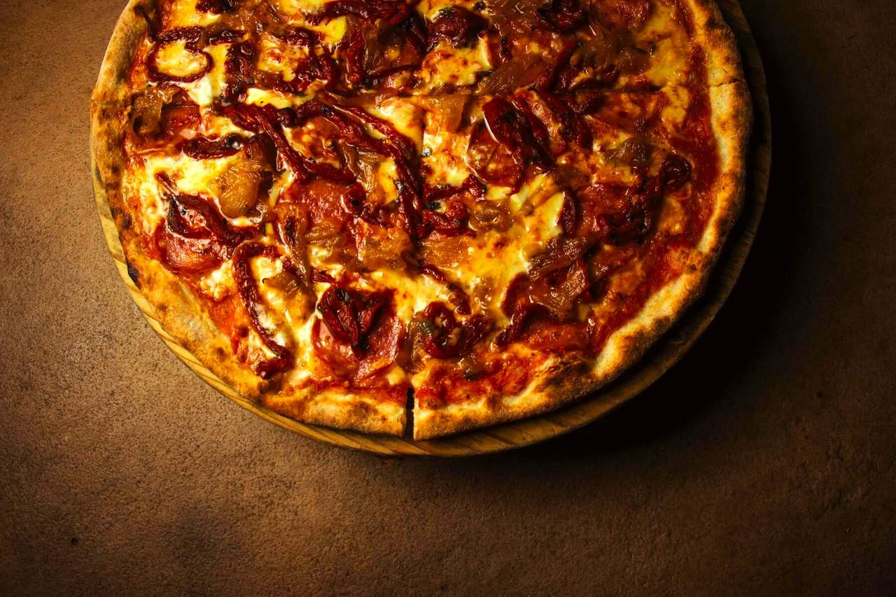 Masa fina, tomate mozzarella, jamón serrano, cebolla caramelizada, reducción de Pedro Ximenez, aceitunas negras y champiñones
