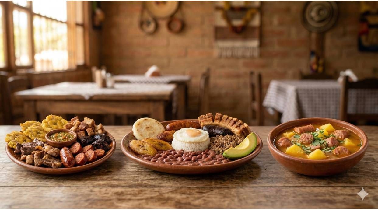 Costillas de cerdo, chicharrón de cerdo, bofe, morcilla, arepa, yuca frita, plátano patacón y maduro frito