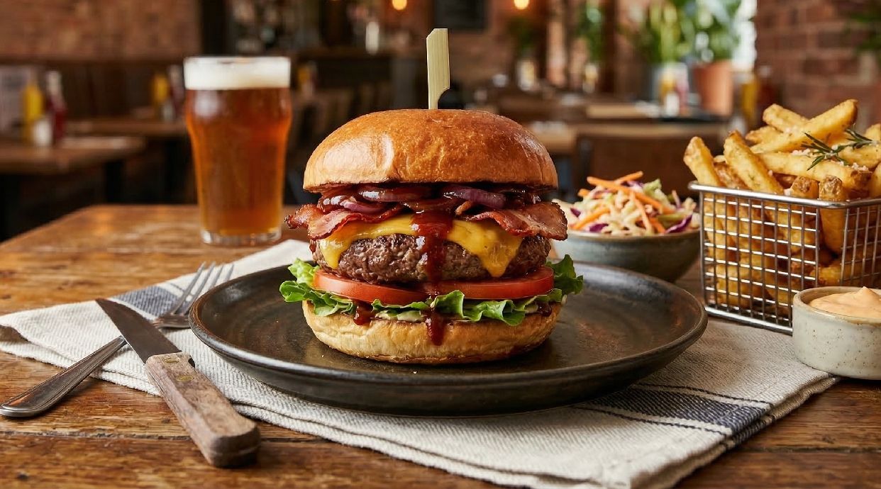 Hamburguesa de ternera jugosa con pan recién horneado, lechuga, tomate y salsa especial.