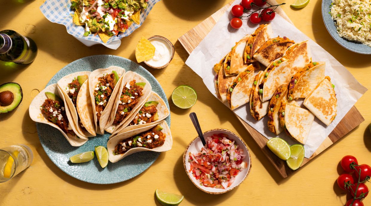 Plato para compartir de carne, queso y verduras salteadas, servido con 6 tortillas