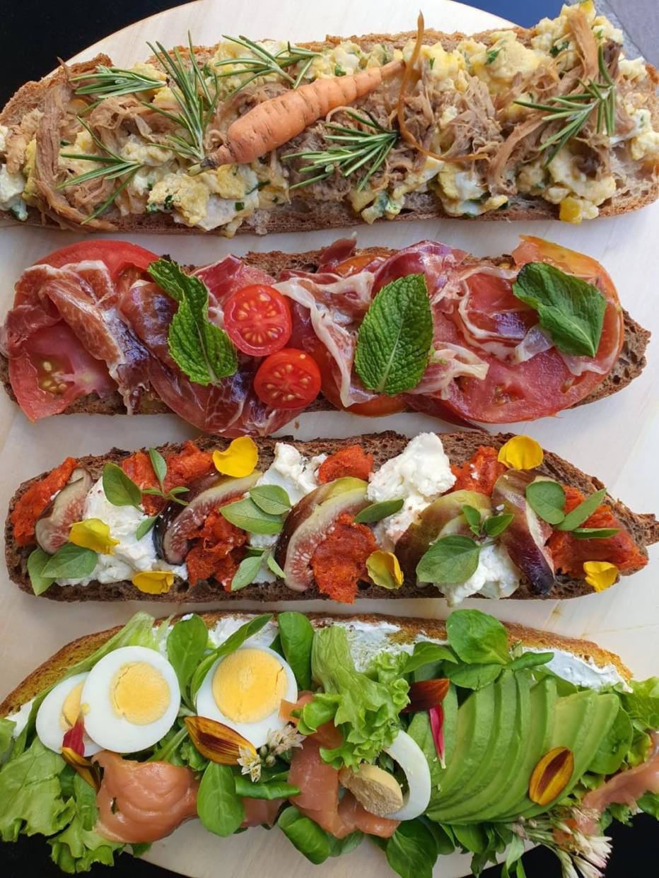 Pan de hogaza, tomate, queso mozzarela, pesto de almendras y albahaca y tomate.