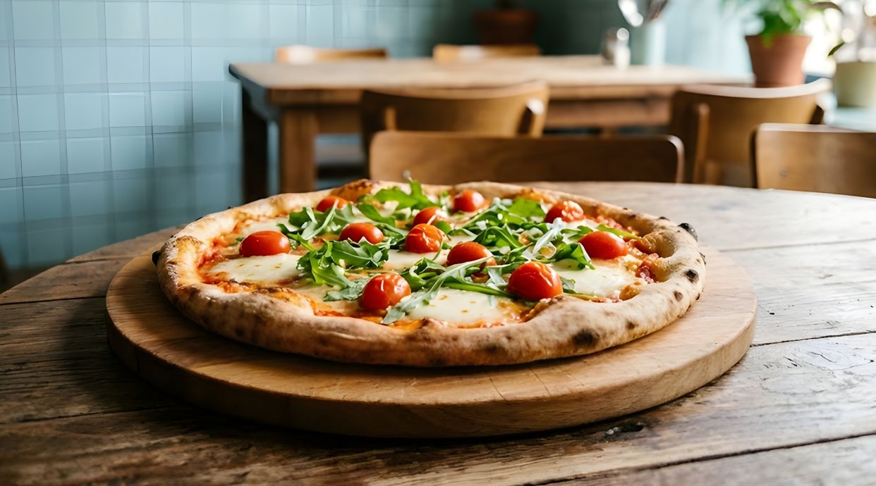 Salsa de tomate, mozzarella fiordilatte, rúcula, tomate cherri y parmesano.