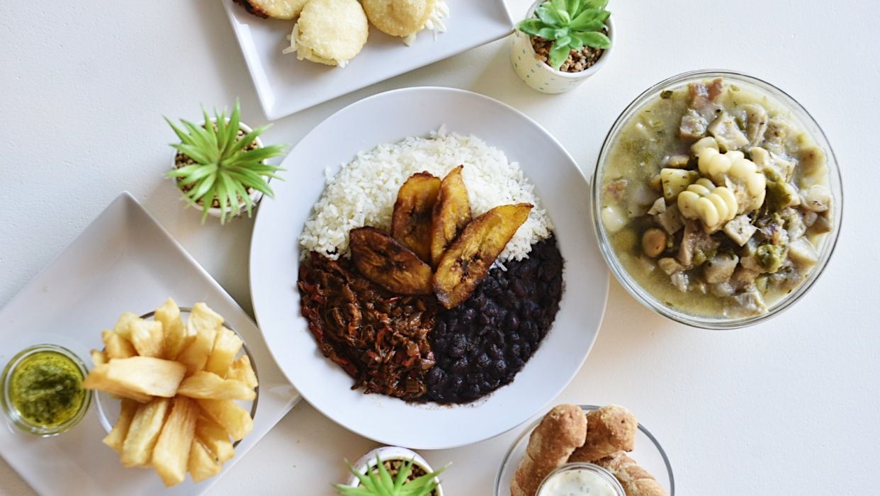 Arroz blanco, carne mechada, alubias negras y tajadas de plátano maduro frito.