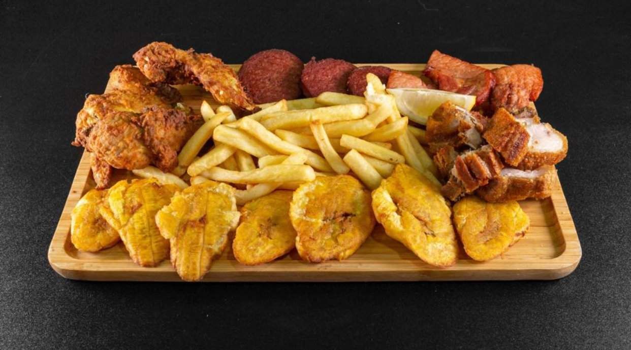 Un surtido variado de carnes. pollo, salami, chueta, longaniza, chicharrón, patacones y patata, para tres personas.