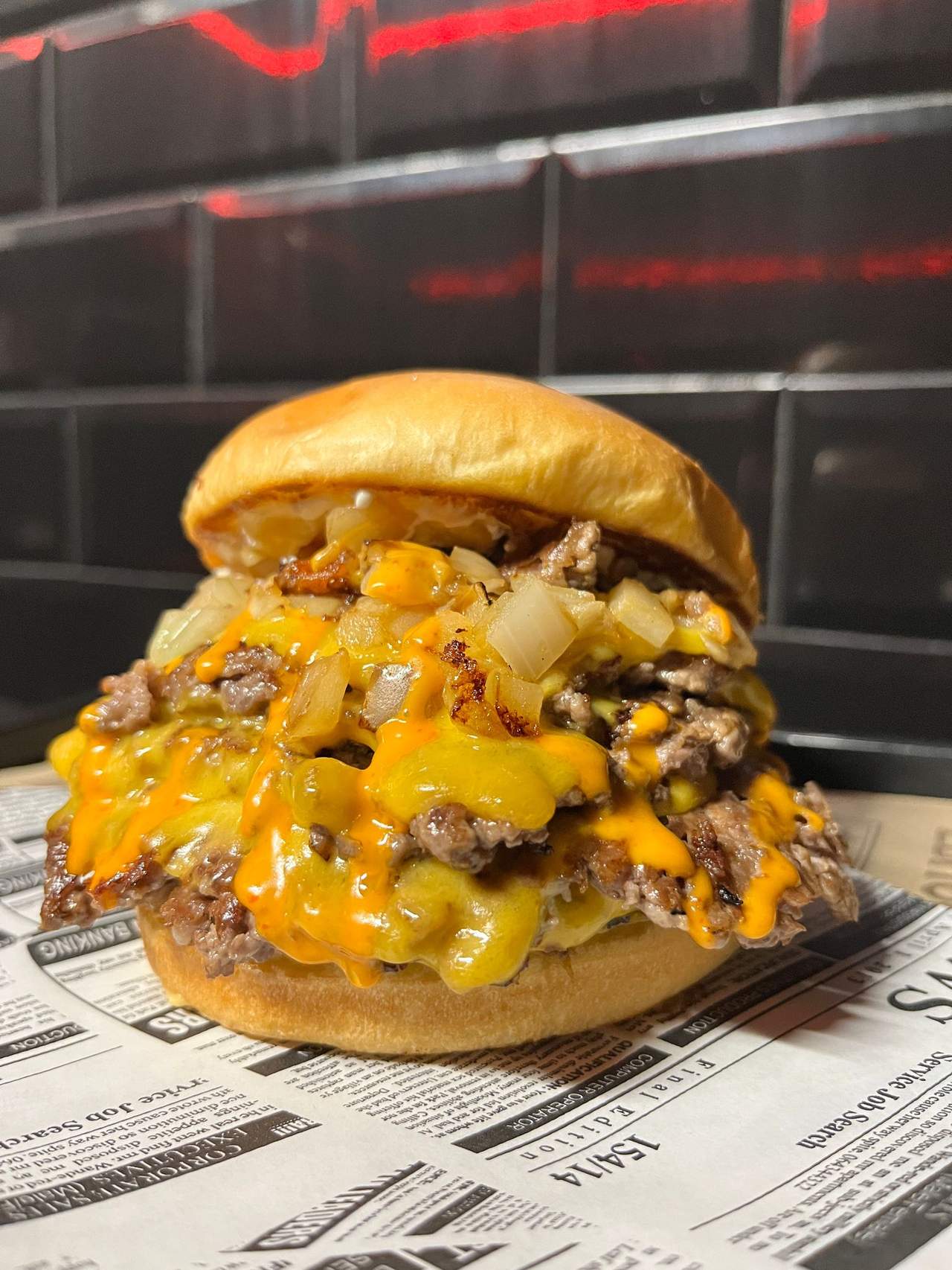 Carne picada (140 g.), queso cheddar doble y salsas secretas. Con patatas o nachos y refresco