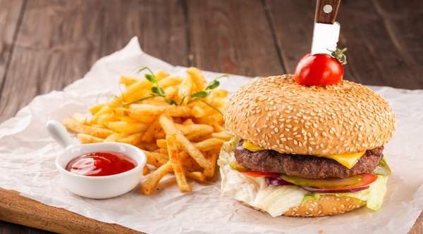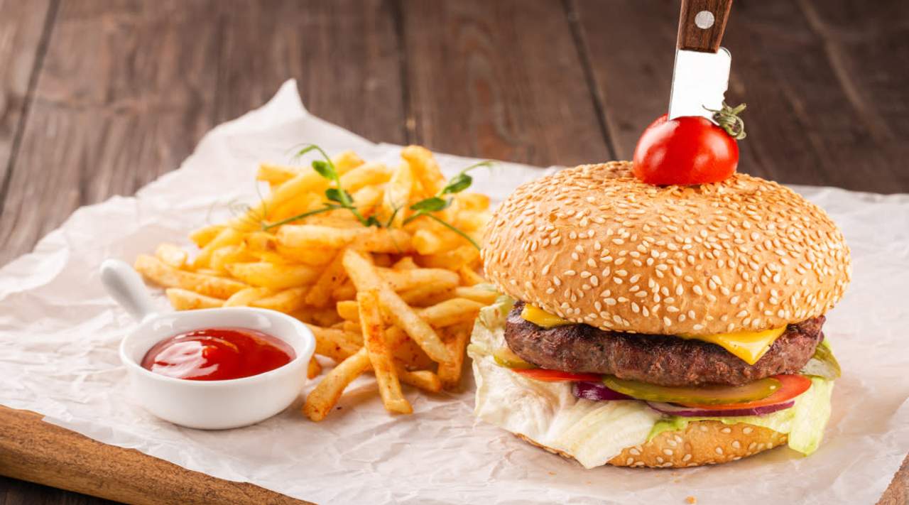 Hamburguesa, lechuga, tomate, cebolla y queso