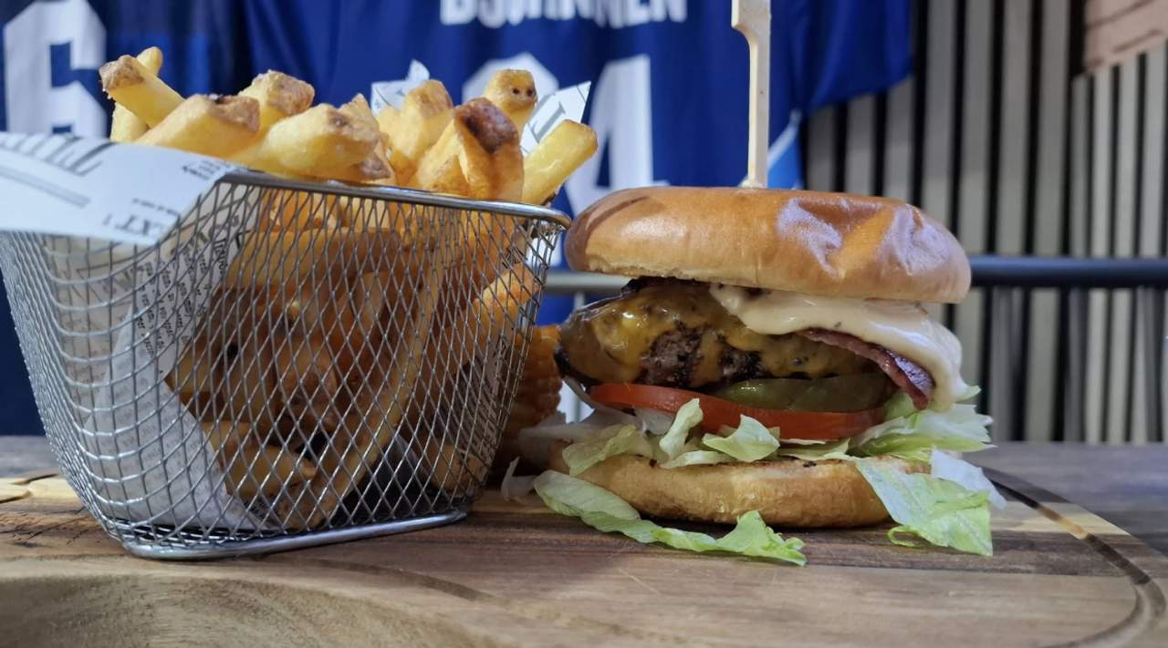Pan brioche, hamburguesa de la casa de (180 g.), mayonesa, lechuga, tomate, pepinillo, cebolla roja encurtida, queso cheddar, tocino y mayonesa rock