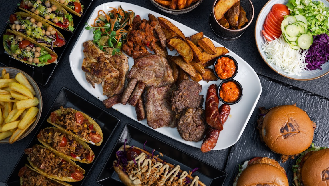 Svinjski vrat i kobasica, juneći ćevapi i gurmanska pljeskavica, BBQ pileća krilca, pileći batak, zabatak i file, hamburger slanina, domaći krumpir, zapečeni grah, ajvar i luk, grilano povrće.