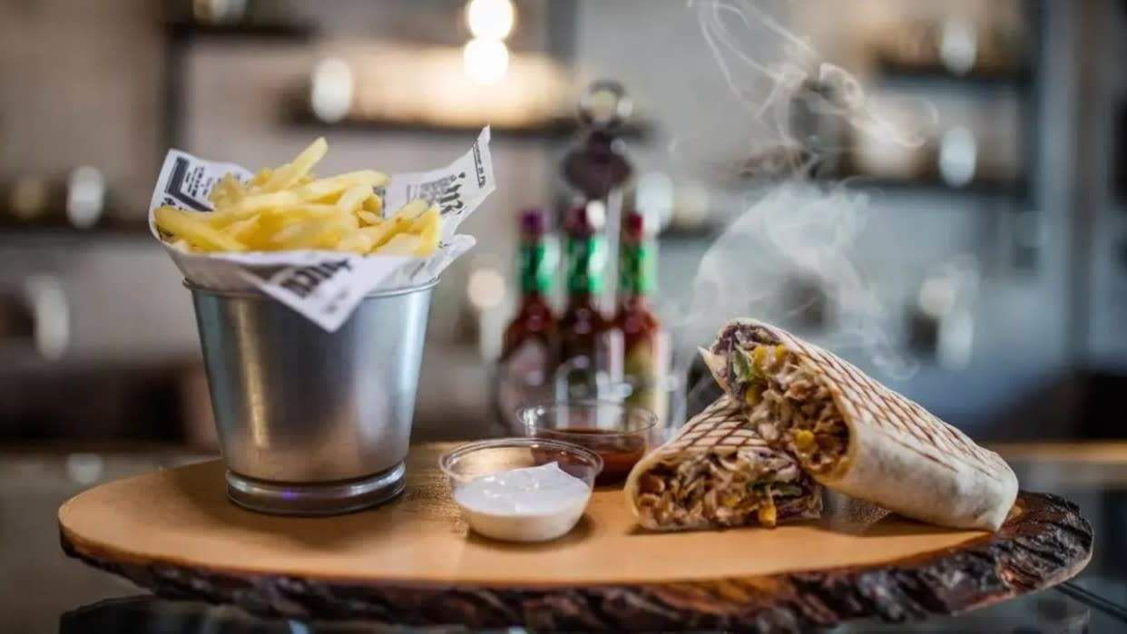 Marinirano pileće meso servirano u tortilji s pesto genovese umakom, mozzarellom, reduciranim aceto balsamicom, rukolom, zelenom salatom, cherry rajčicama i maslinama, uz Fry n’ Dip Fries s ribanim sirom i začinskim biljem te French Fries dipom