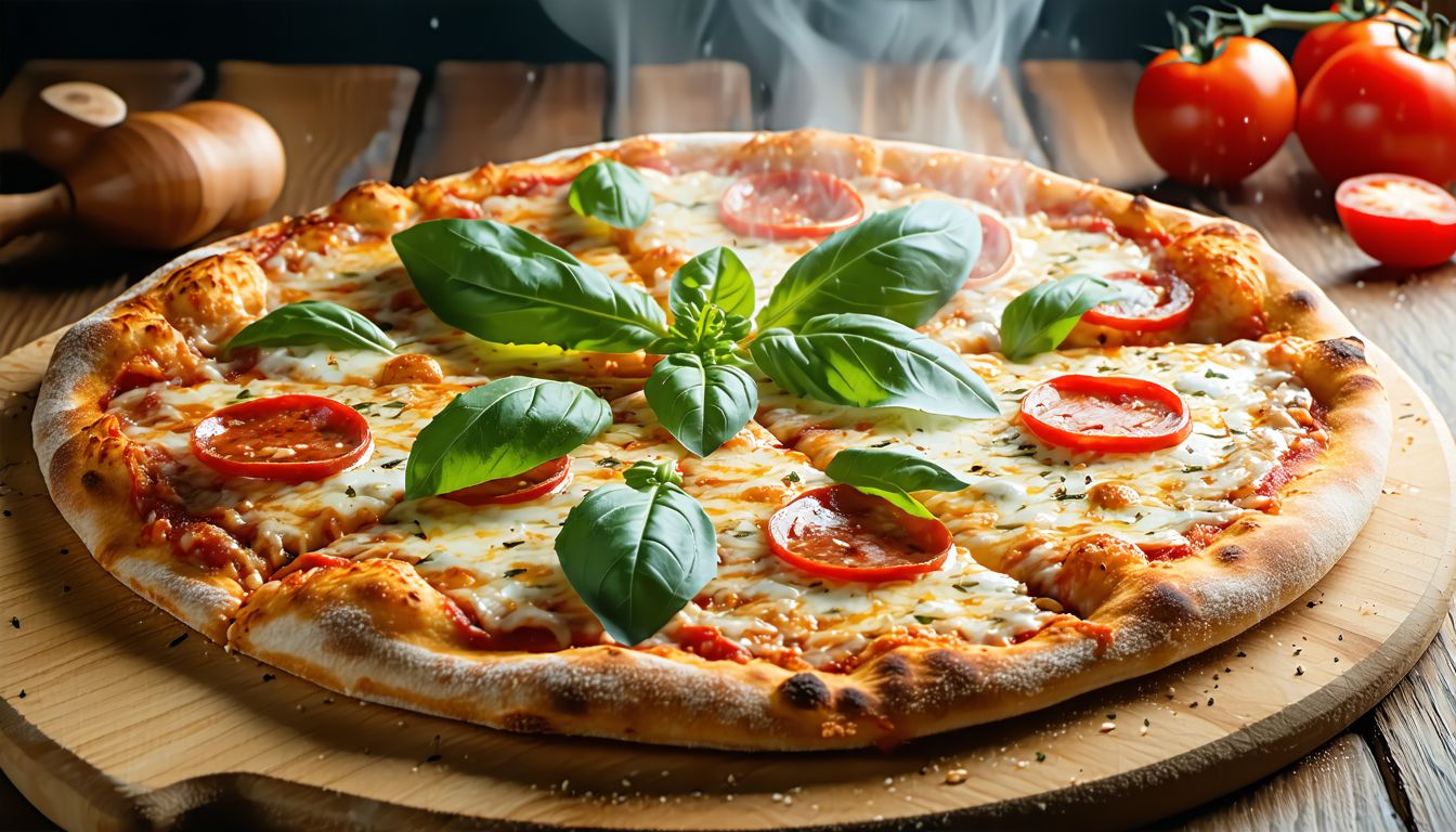 San Marzano pelati, mozzarella fior di latte, bosiljak, maslinovo ulje, parmezan, masline, origano