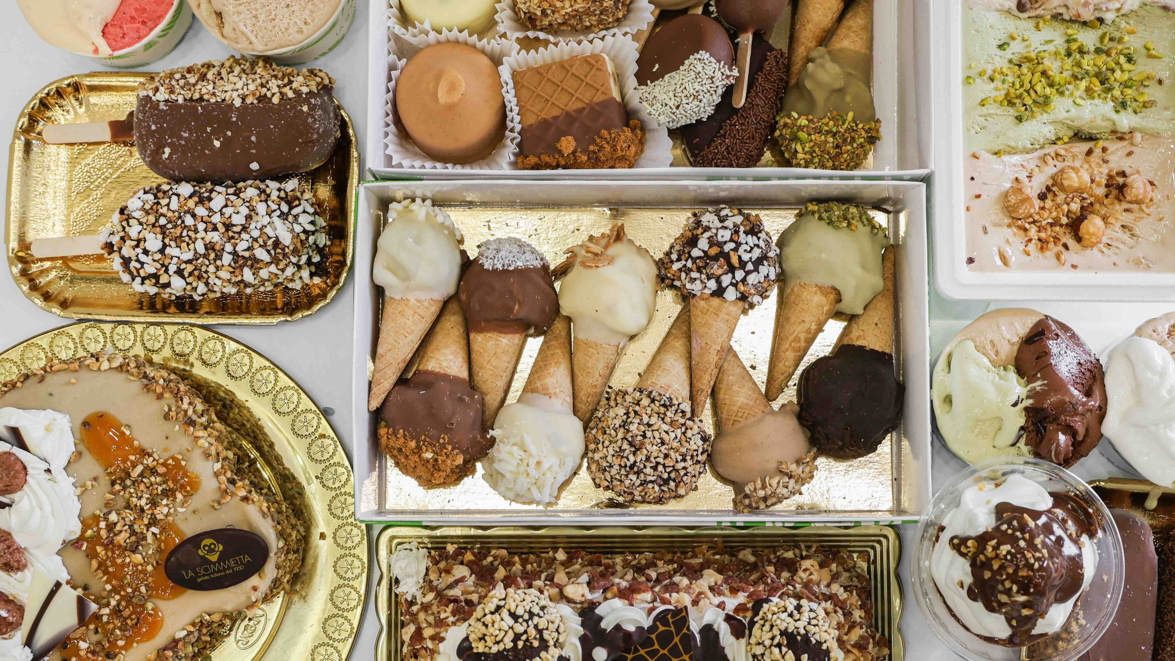 Gelato pistacchio, gelato mandorla e variegatura all'arancio.