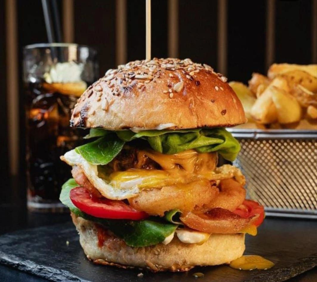 Pane Bun Home Made , uovo ,anelli di cipolla panati, doppio bacon croccante ,burger di Manzo circa 180 gr,lattuga,pomodoro e salsa BBQ. Chips incluse!