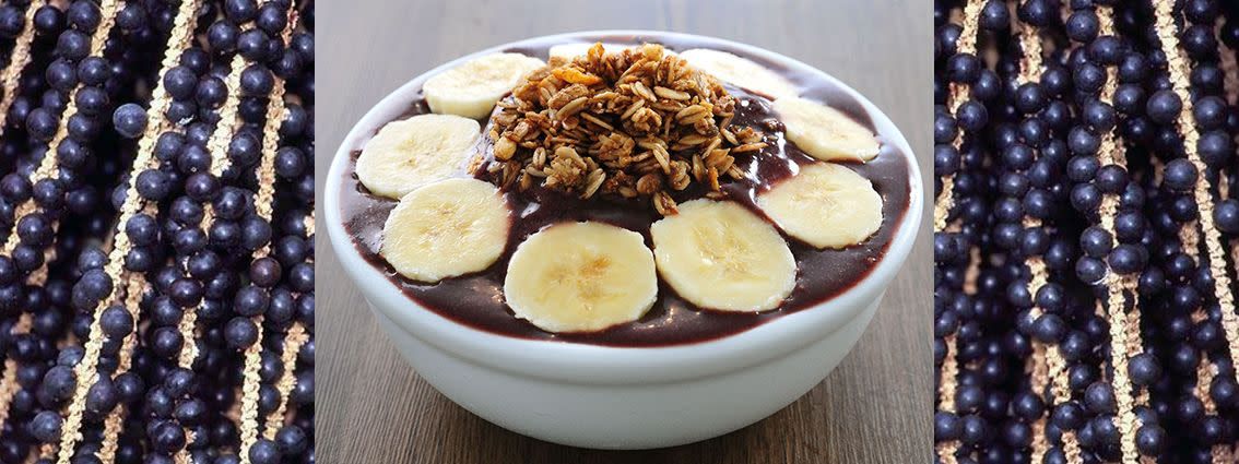 Açai frullato con banana e guaranà guarnito con granola di avena e banane a fette. e