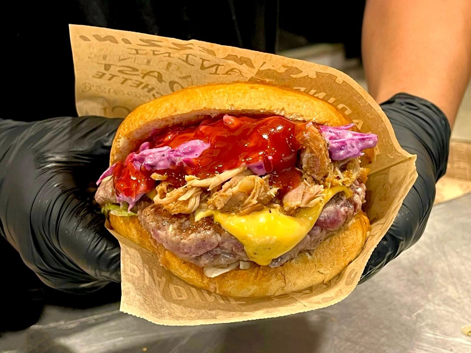 Hamburger, pulled pork, formaggio fuso, poca cipolla di caramellata salsa bbq, bacon, insalata e radicchio, leggermente piccante