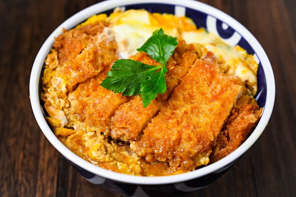 Cotoletta di maiale servita su riso bianco, con cipolla, uova, salsa teriyaki e sesamo.