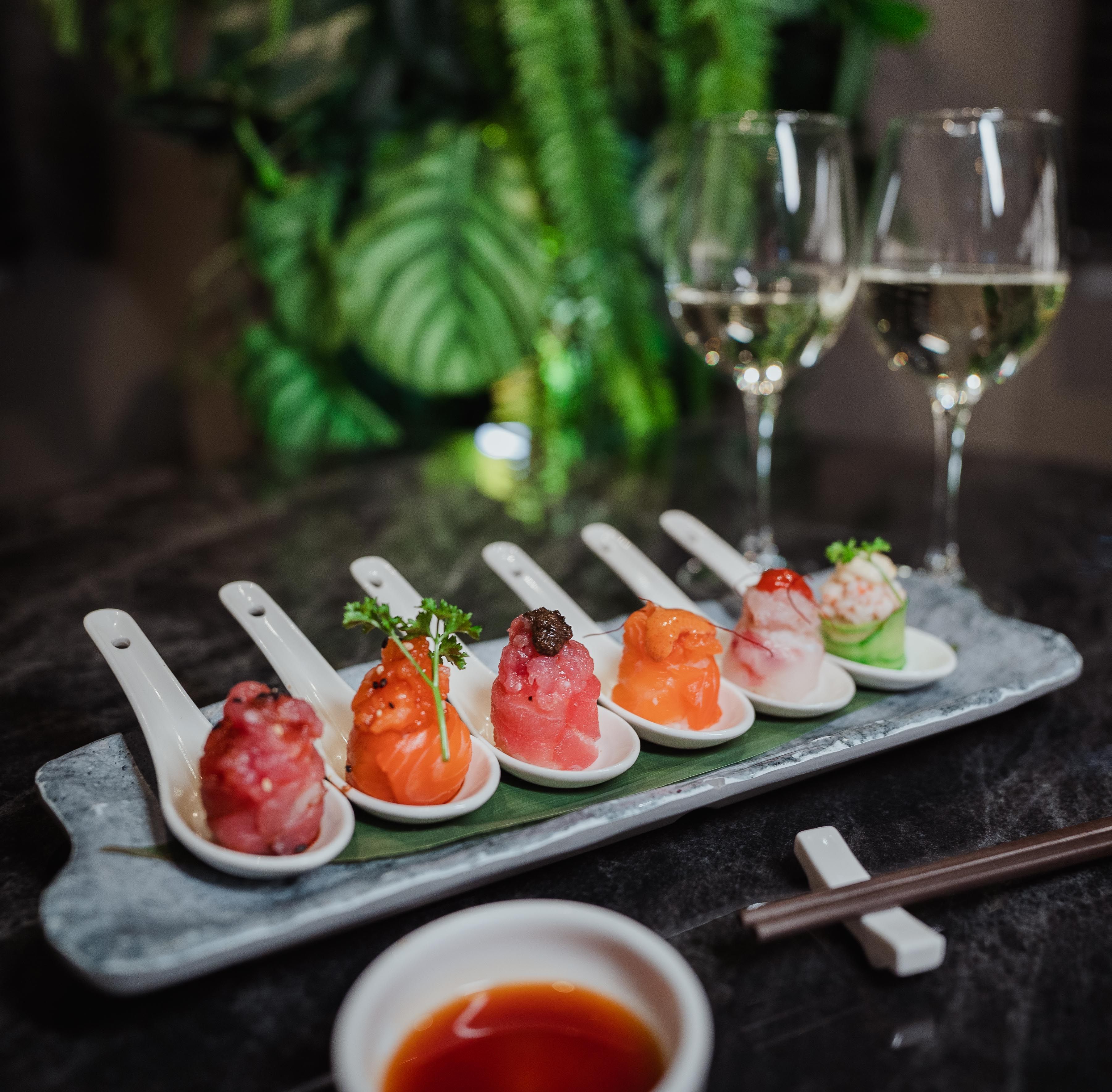 Carpaccio di salmone con mango, salsa ponzu e salsa speziata dello chef