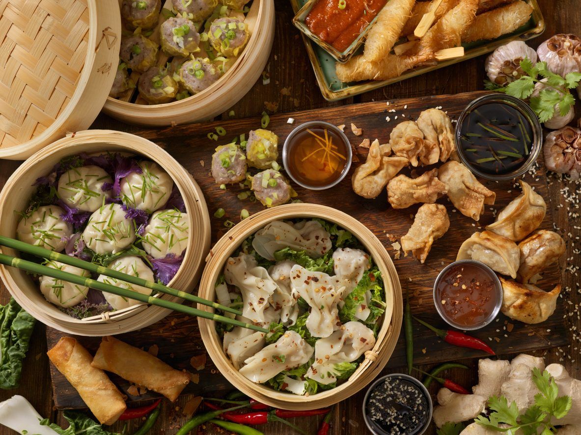 2 Ravioli di manzo e verdure, 2 ravioli di maiale e cipolla, 2 ravioli di maiale e crauti e ravioli di verdure bagnati in salsa di soia