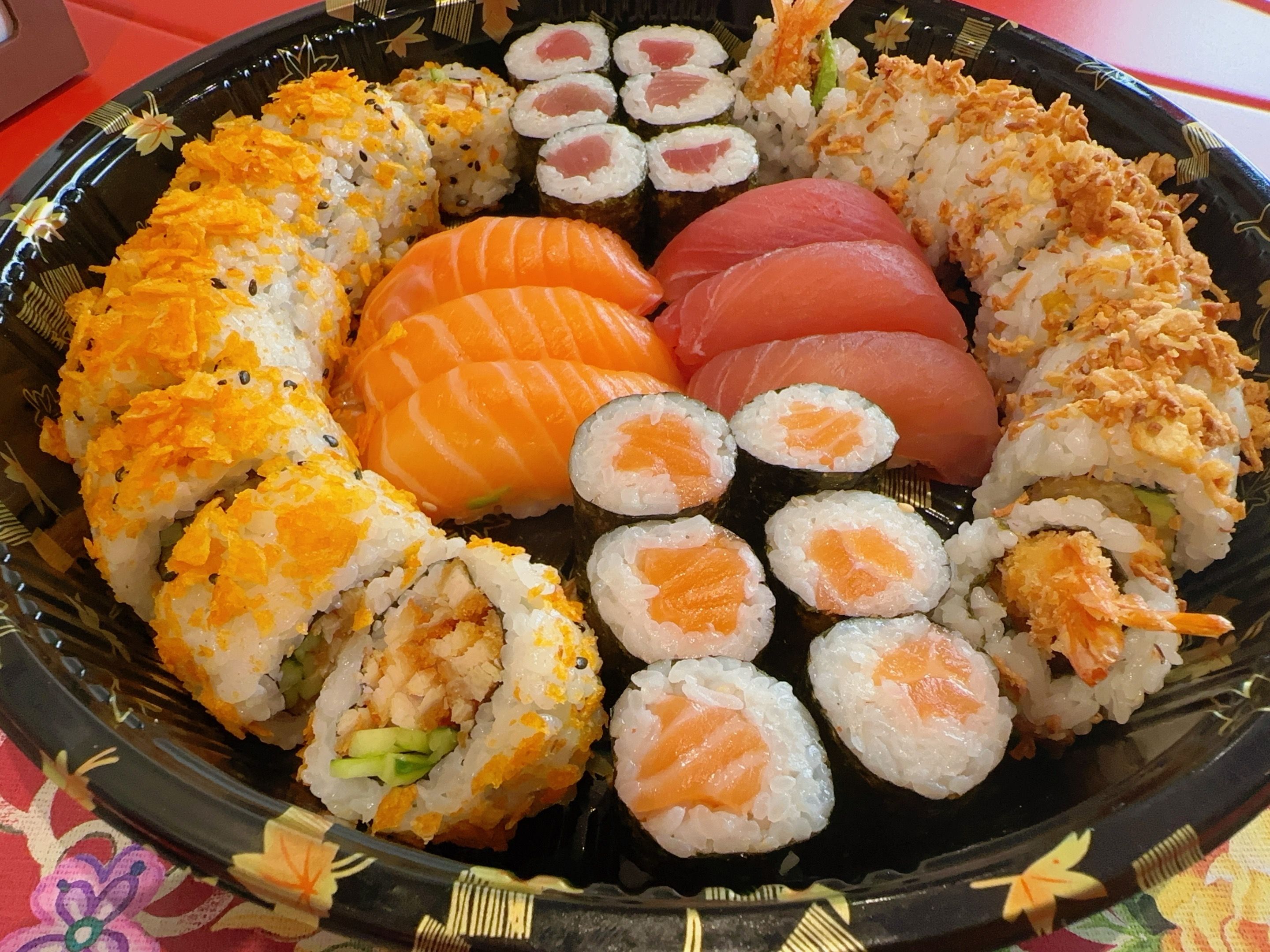 Tori katsu roll 8pz ,ebi fry roll 8pz, sake maki 6pz, Maguro maki 6pz,sake nigiri 3 pz, Maguro nigiri 3pz