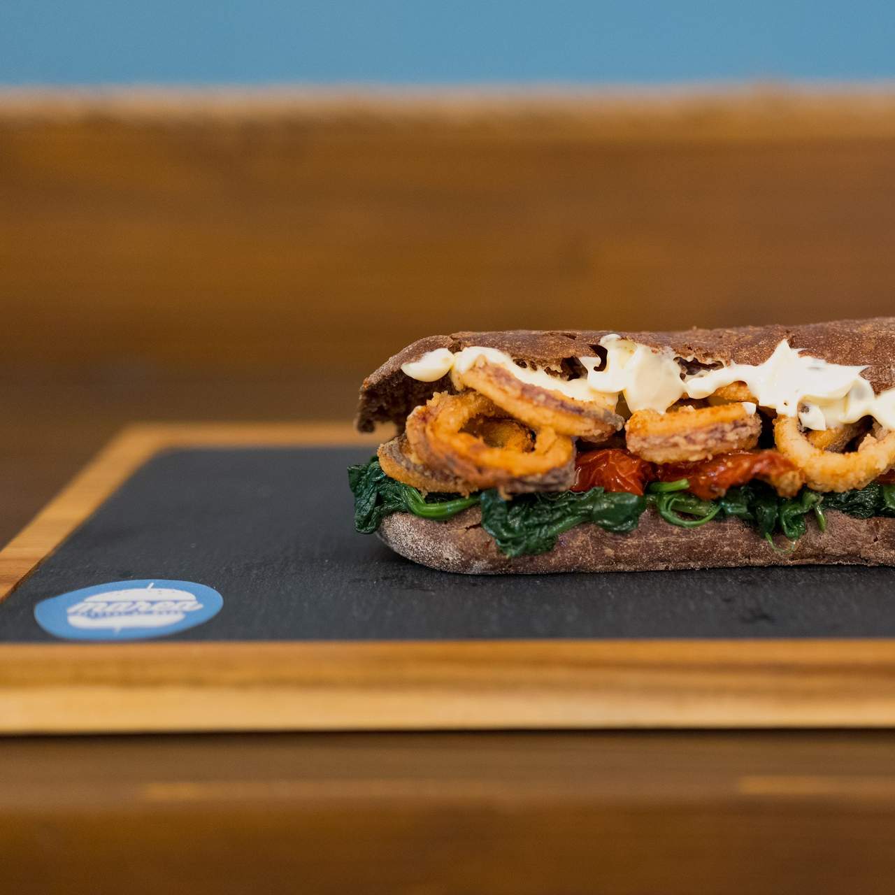 Bun artigianale di grani antichi siciliani, calamari fritti, friarielli saltati, pomodoro secco, stracciatella di bufala, salsa Caesar