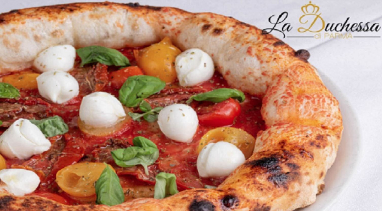 Pomodoro pelato italiano, fior di latte di Agerola, prosciutto crudo di Parma 24 mesi Ponte Romano, rucola, scaglie di Parmigiano Reggiano DOP
