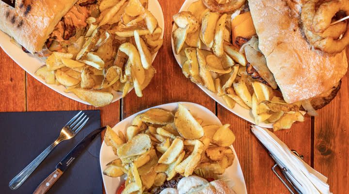 Hamburger di manzo pregiata fassona piemontese 200 g, pomodoro, insalata, cheddar, cipolla, bacon, salsa rosa - patate fritte incluse nel box
