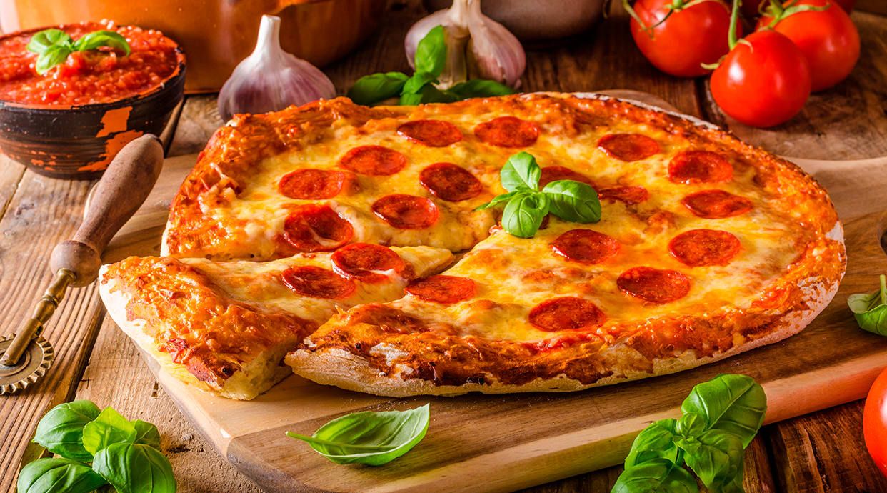 Pomodoro, mozzarella, salame piccante, acciughe, funghi e olive